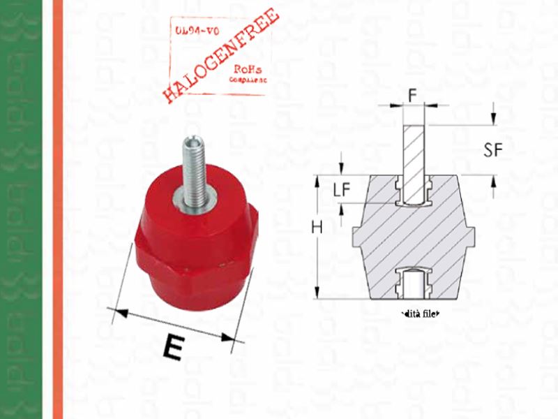Gli isolatori porsbarre ISOESA sono cotruiti in massa poliestere con una percentuale di fibra di vetro del 18/20%. La colorazione standard è rosso RAL 3002, fornibli anche in altri colori e con caratteristiche antiacido (minimi ordinabili da definire). Gli inserti metallici femmina e maschi, incorporati alle estremità sono rispondenti all normativa RoHS.